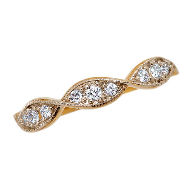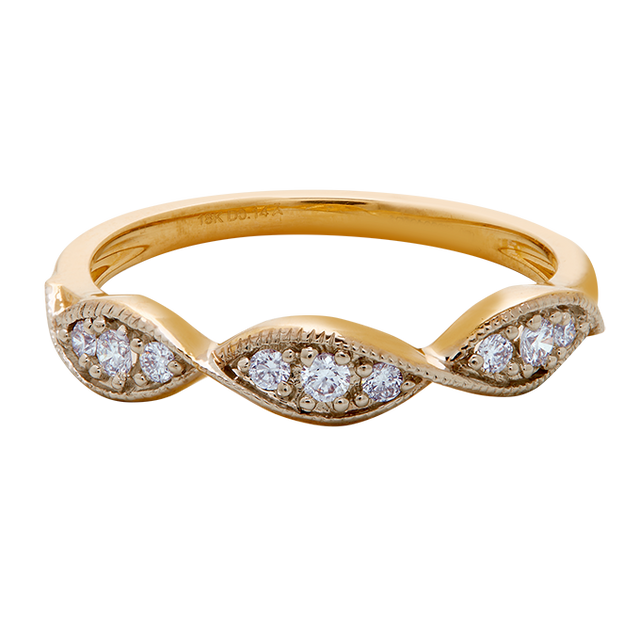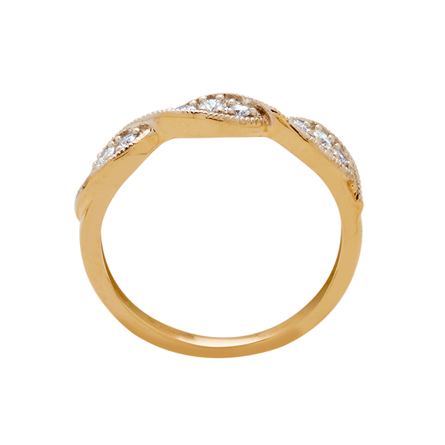 The Mirelle Wave Diamond Band features gentle gold curves cradling clusters of round-cut diamonds. With its flowing silhouette and rhythmic sparkle, this ring brings a poetic grace to every gesture.