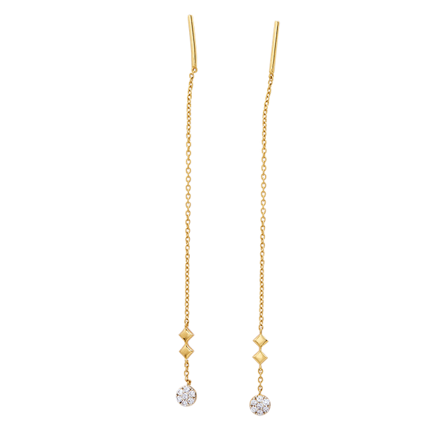 Minimalism meets movement in our Solitaire Drop Chain Earrings. Suspended from delicate gold chains, each earring showcases a single, brilliant solitaire that sways gently with every turn. Light, graceful, and undeniably radiant—an effortless way to elevate your everyday elegance.