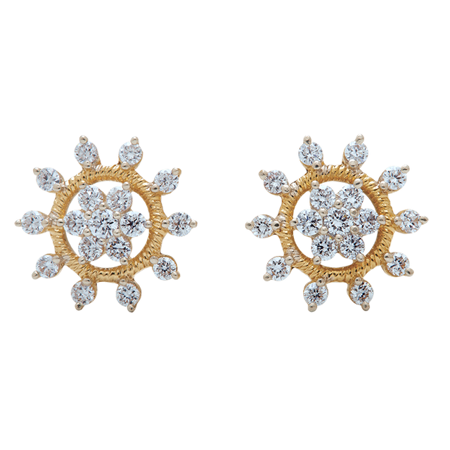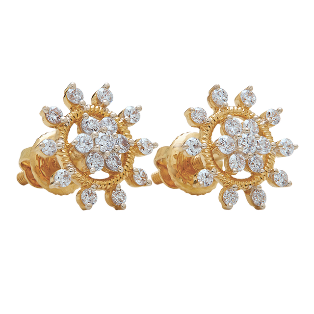 Radiate brilliance with our Sunburst Floral Diamond Studs. At the heart lies a delicate floral motif crafted from shimmering diamonds, encircled by a sun-like halo that adds depth and drama. This radiant design captures the warmth of sunlight and the charm of blooming flowers — a perfect fusion of strength and softness.
