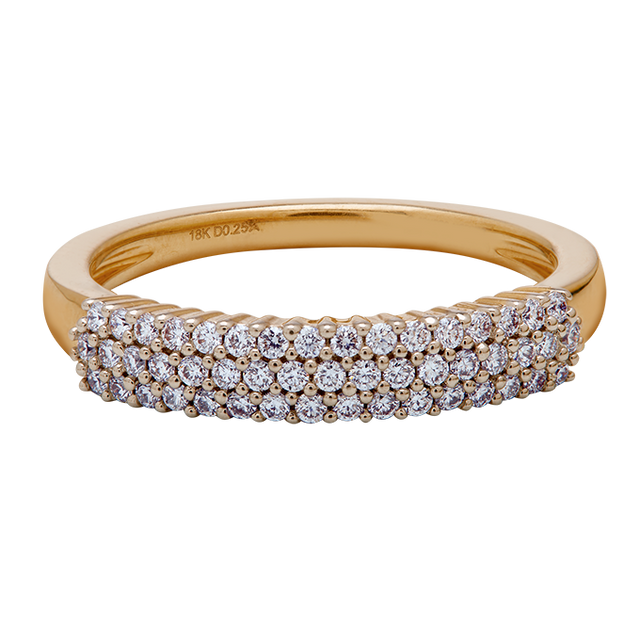 The Trio Gold Band is a masterpiece of understated luxury, featuring three rows of meticulously set pave diamonds along a smooth gold band. Its balanced design offers a perfect harmony of sophistication and simplicity, making it an ideal piece for those who appreciate refined beauty.