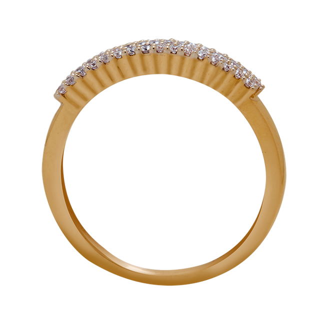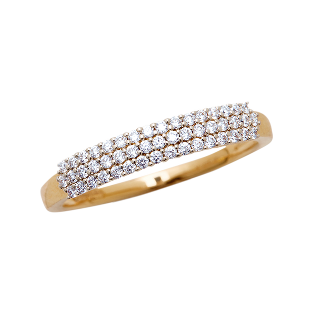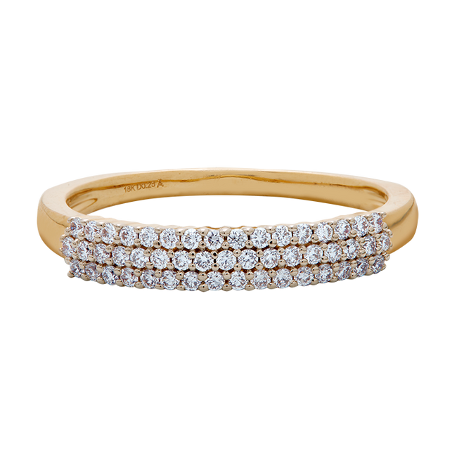 The Trio Gold Ring is a statement of refined elegance, featuring three rows of pave diamonds set against a rich gold band. Its clean lines and sparkling diamonds combine to create a timeless piece, ideal for those who seek a blend of modern luxury and classic charm.