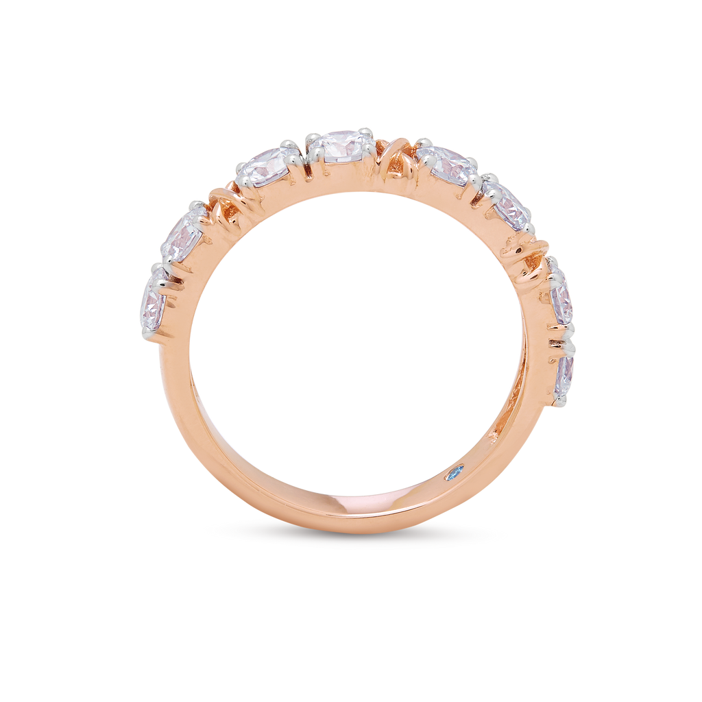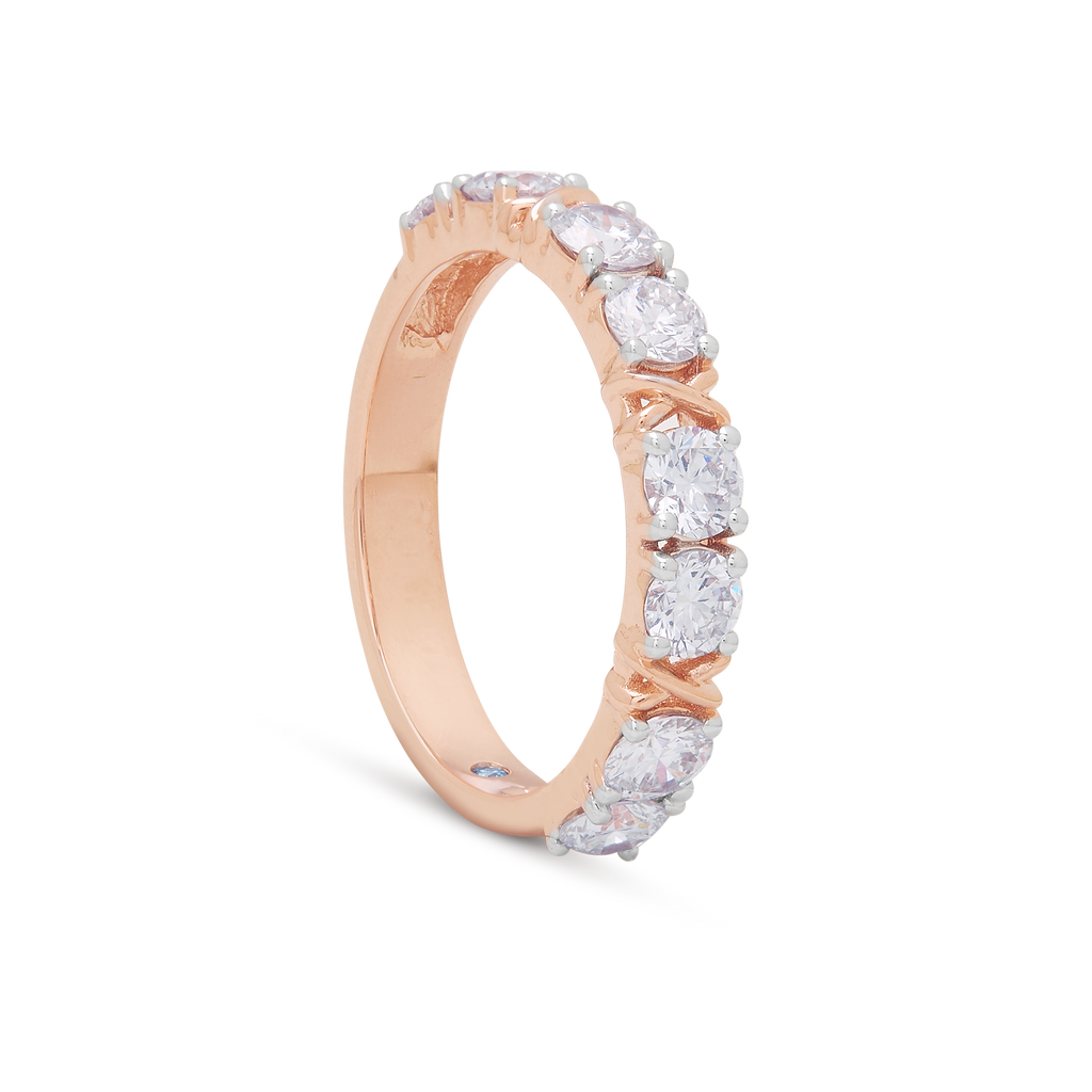 Warm rose-gold prongs intertwine to cradle each round diamond in a delicate X—creating a lyrical sequence of light that sings around your finger.