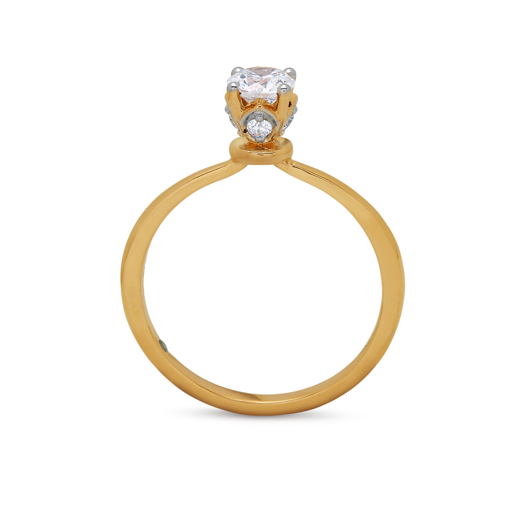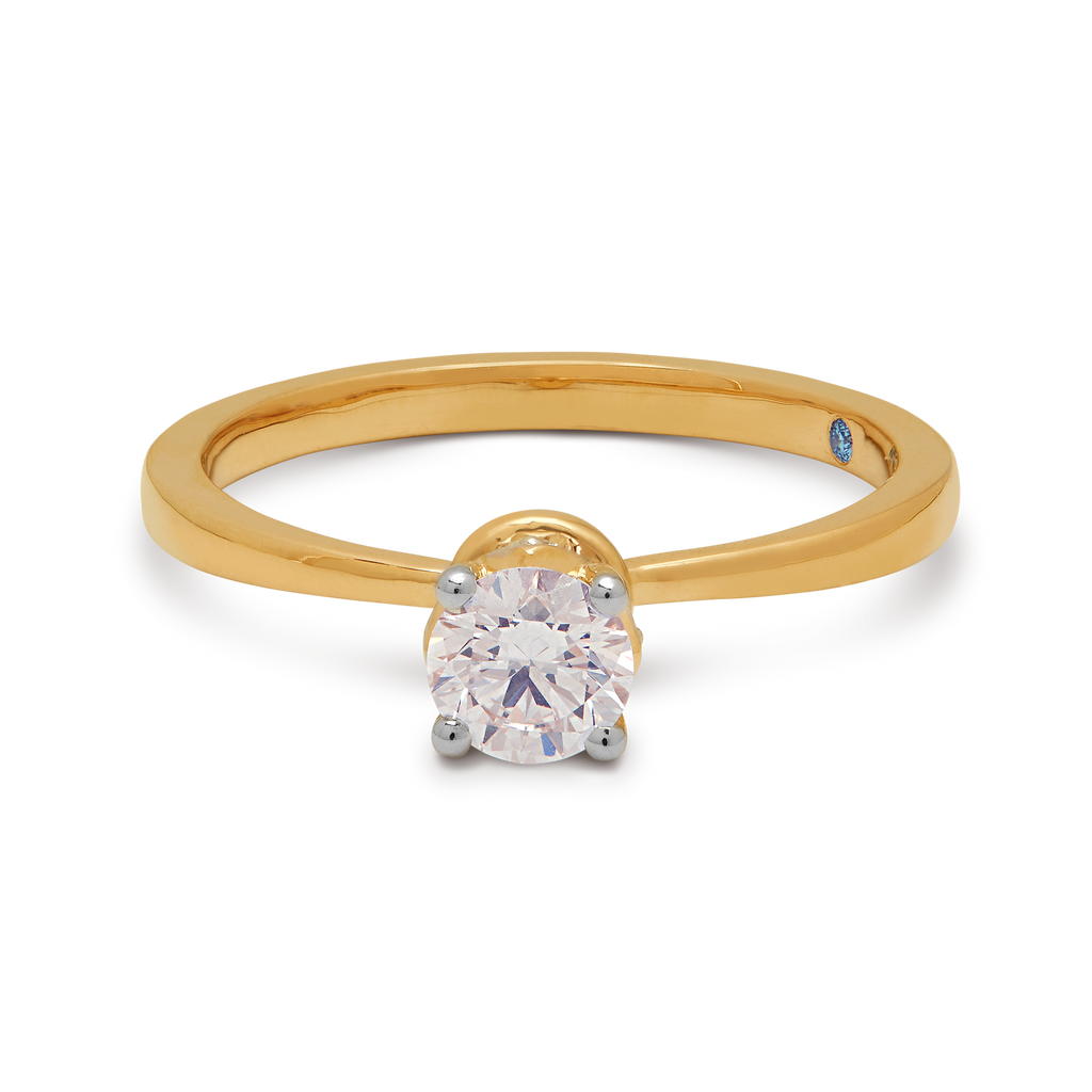 A sleek yellow-gold band with subtle angled shoulders that lift a brilliant round solitaire—where minimalist lines meet radiant light.