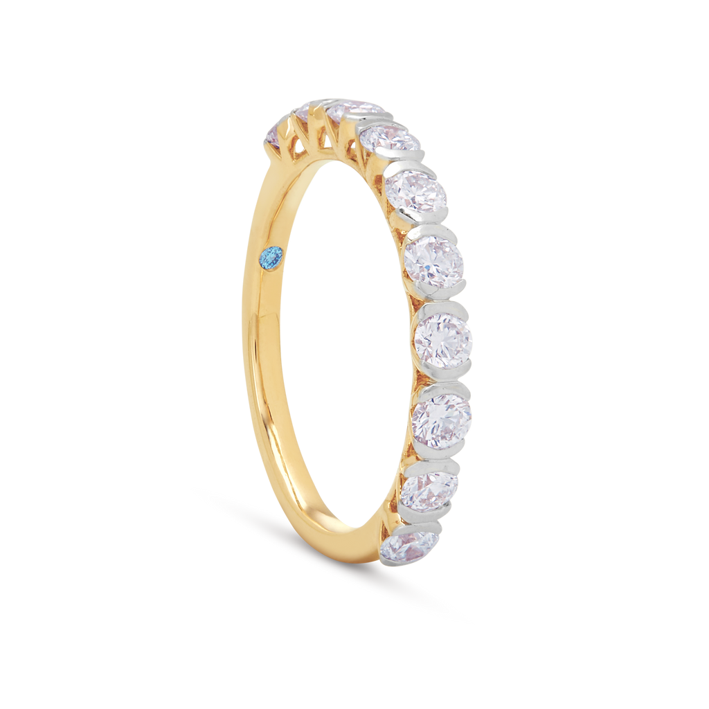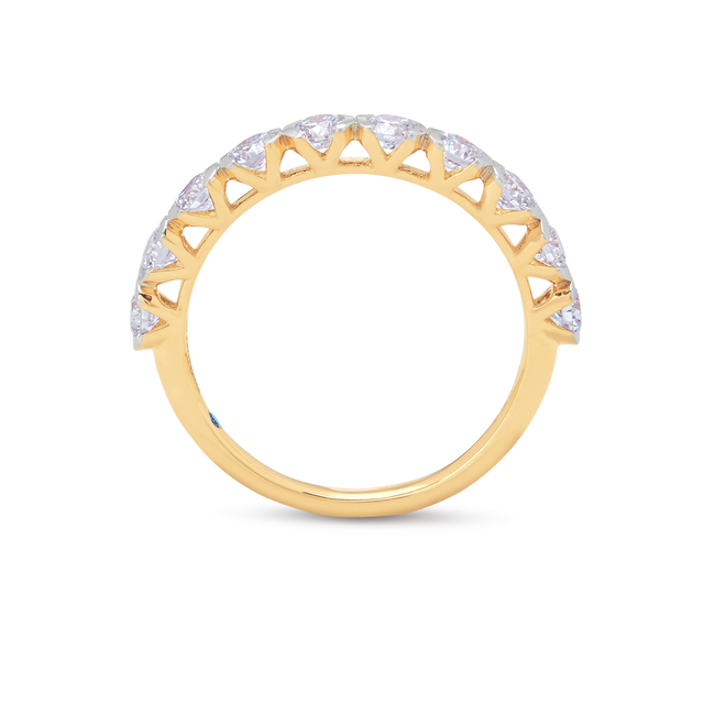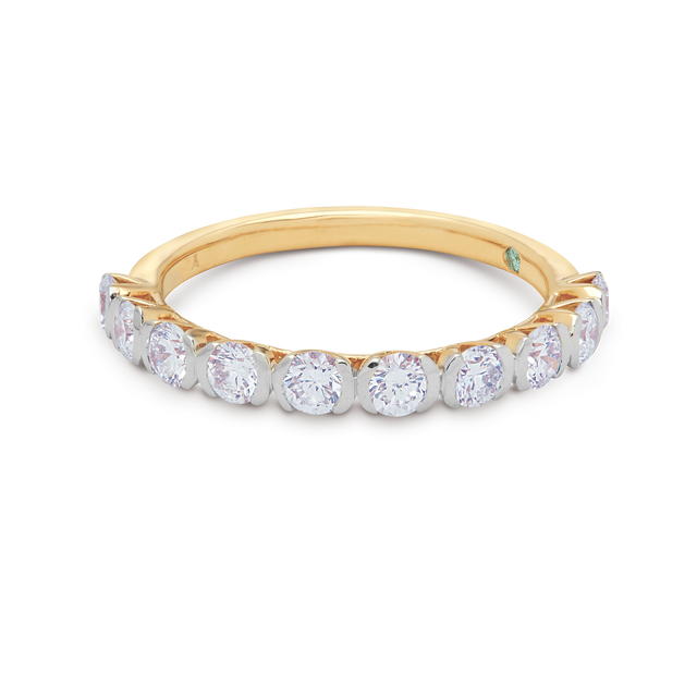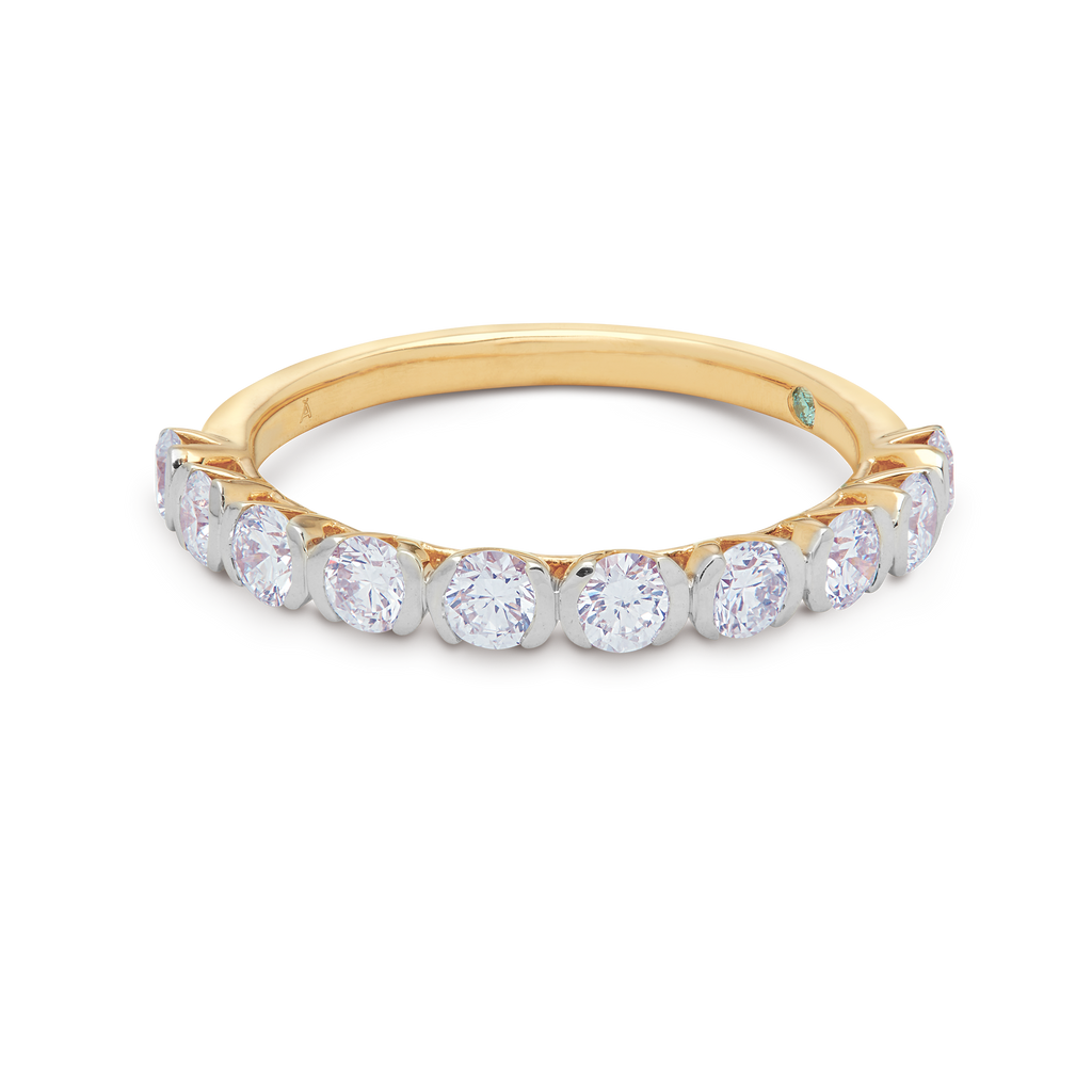 Round diamonds cradled in white-gold prongs trace a seamless curve along a yellow-gold band—endless light, timeless elegance.