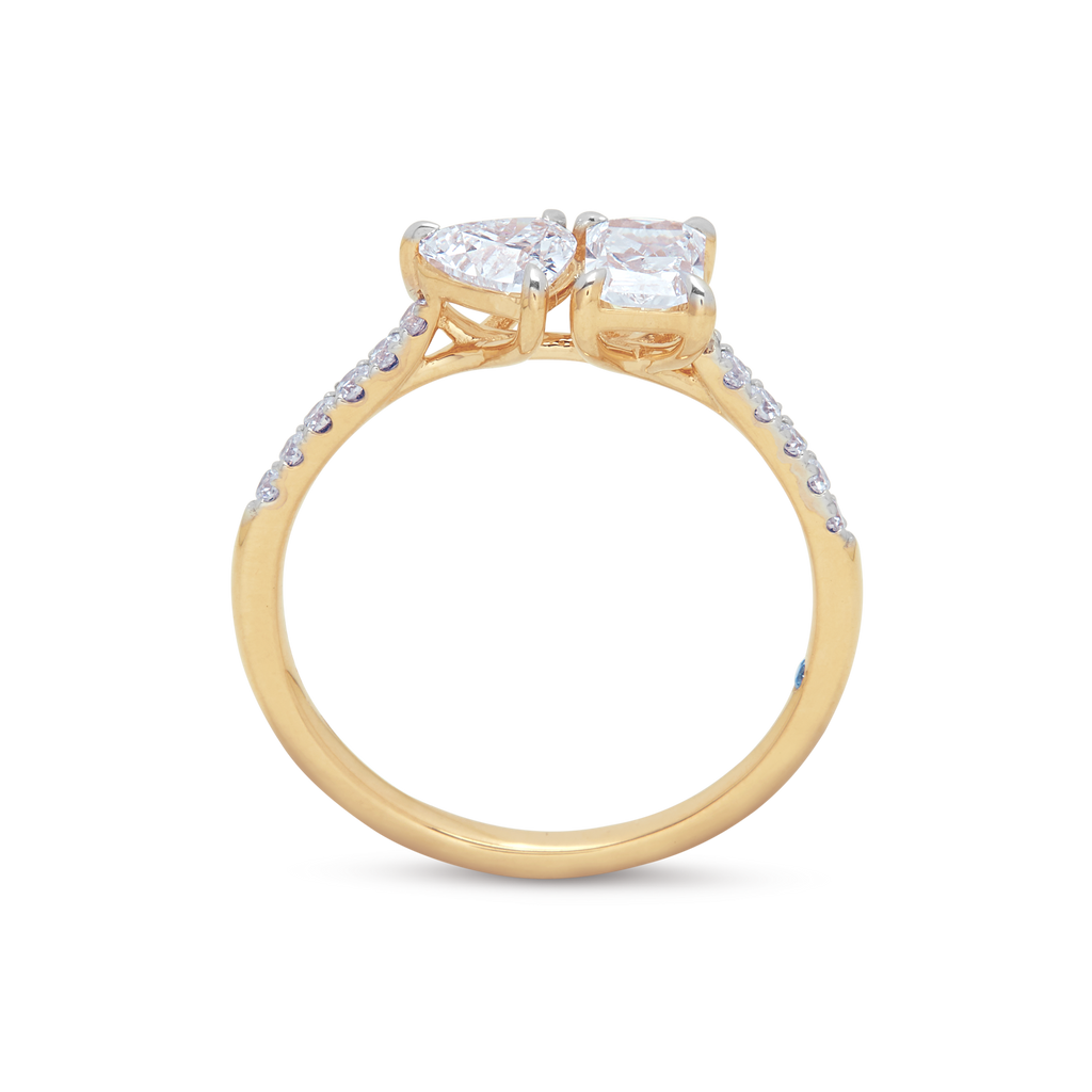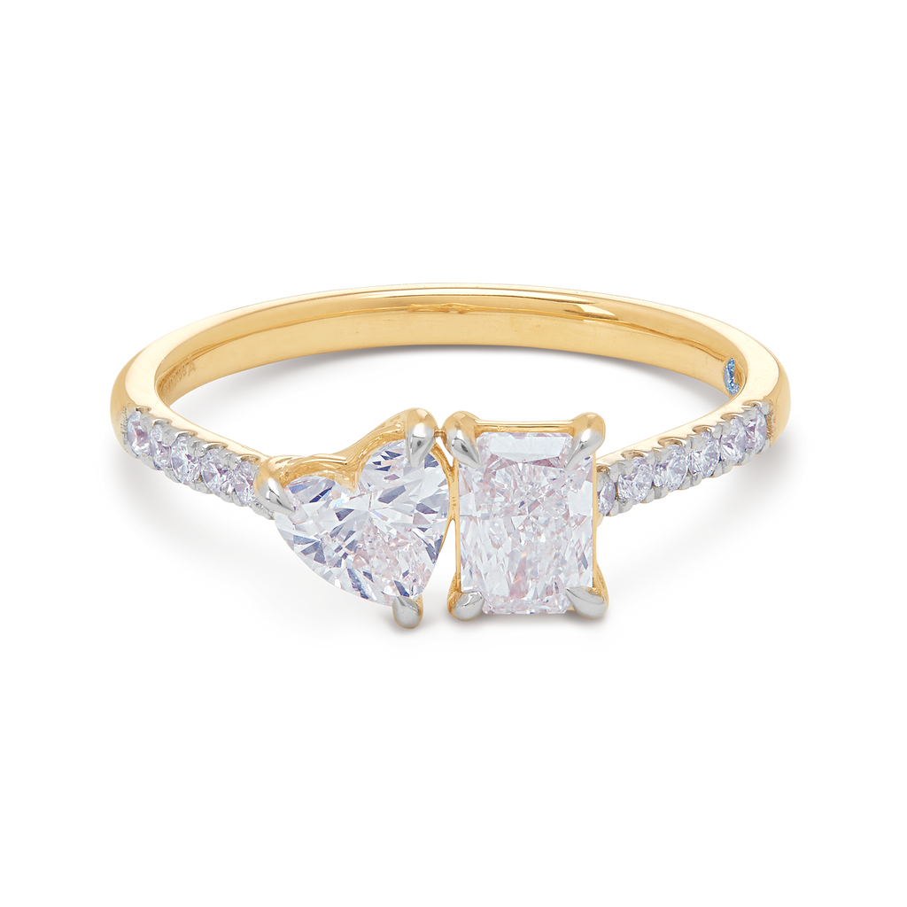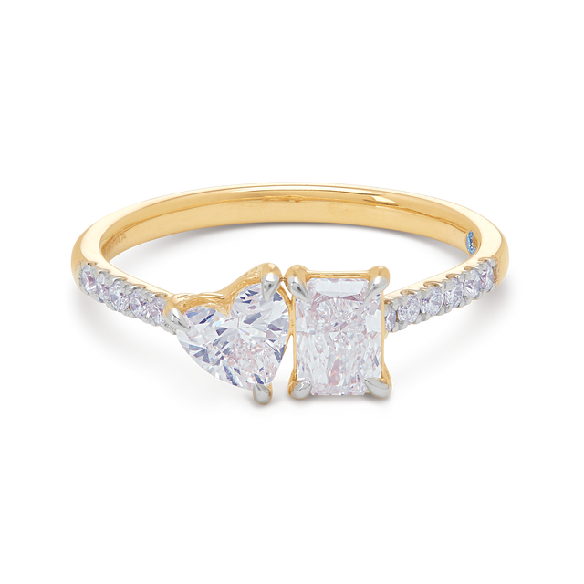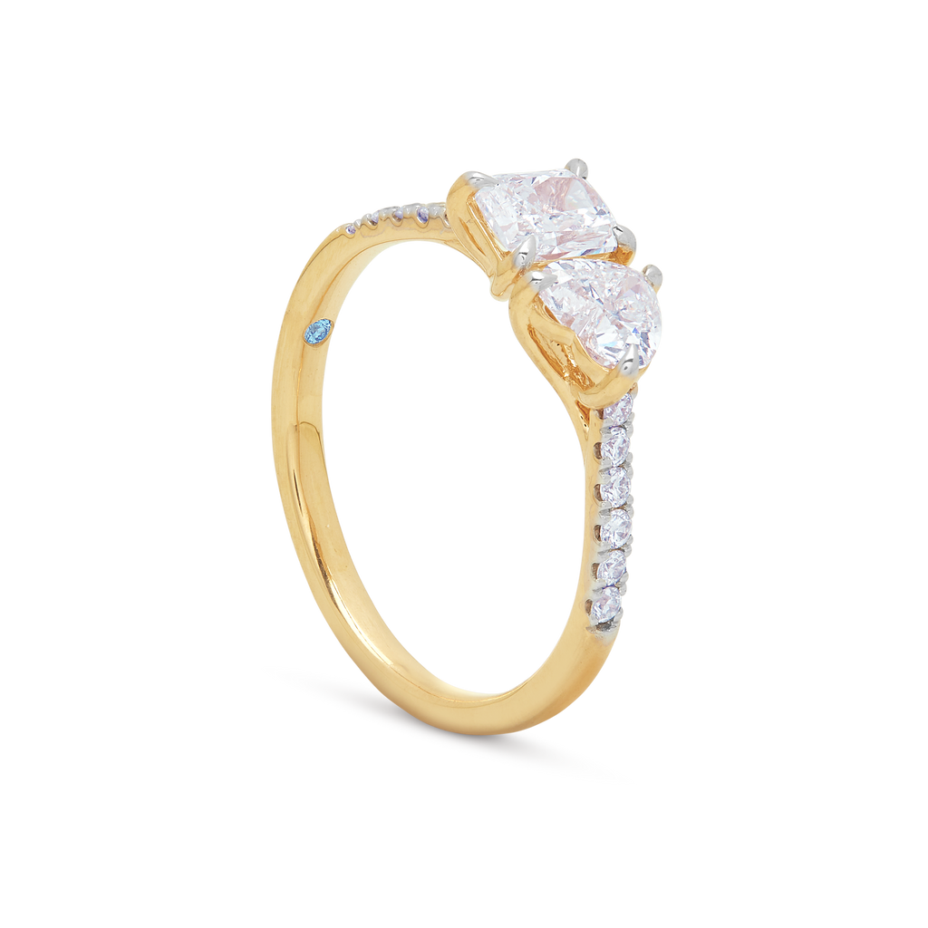 A radiant-cut diamond meets its trillion-cut counterpart atop a slender yellow-gold band, shoulder-dusted in pavé—where two stones unite in an enchanting harmony of light.