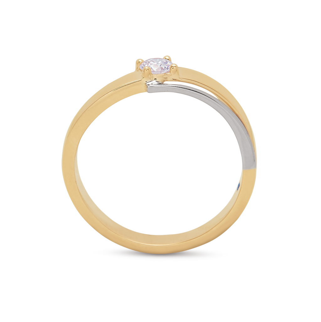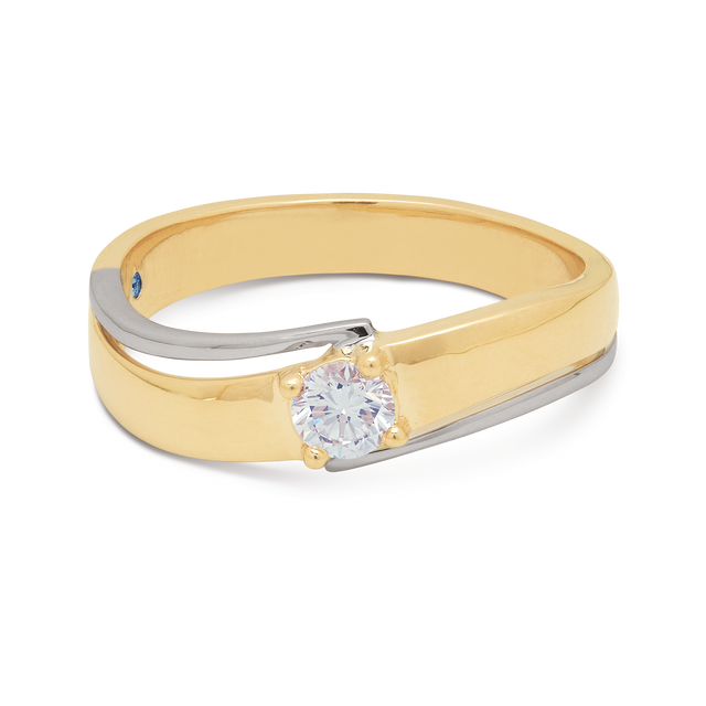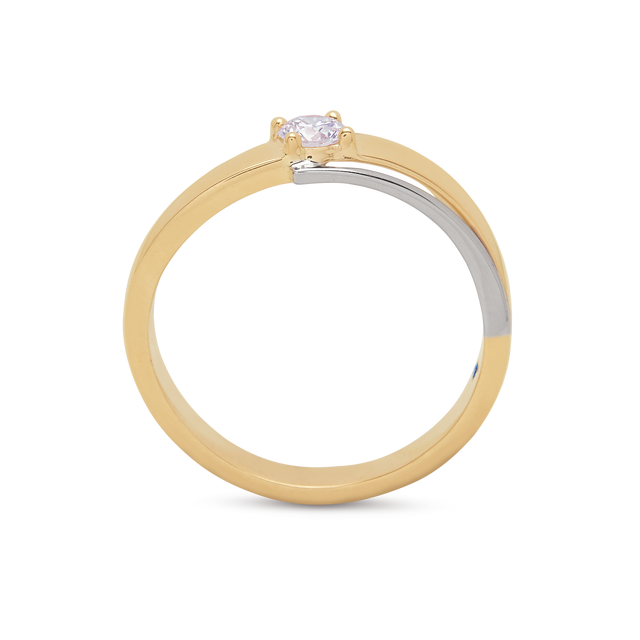 A yellow-gold band accented by a flowing white-gold ribbon that sweeps around to cradle a brilliant round solitaire—contrasting hues meet minimalist precision.