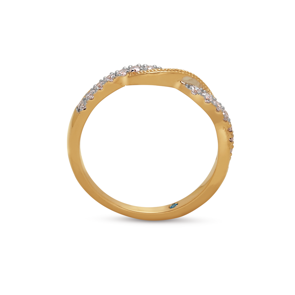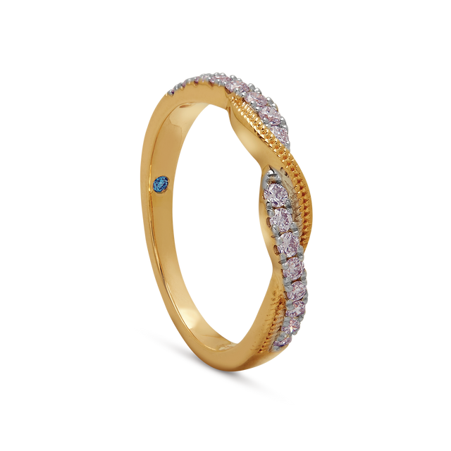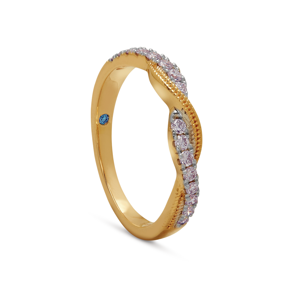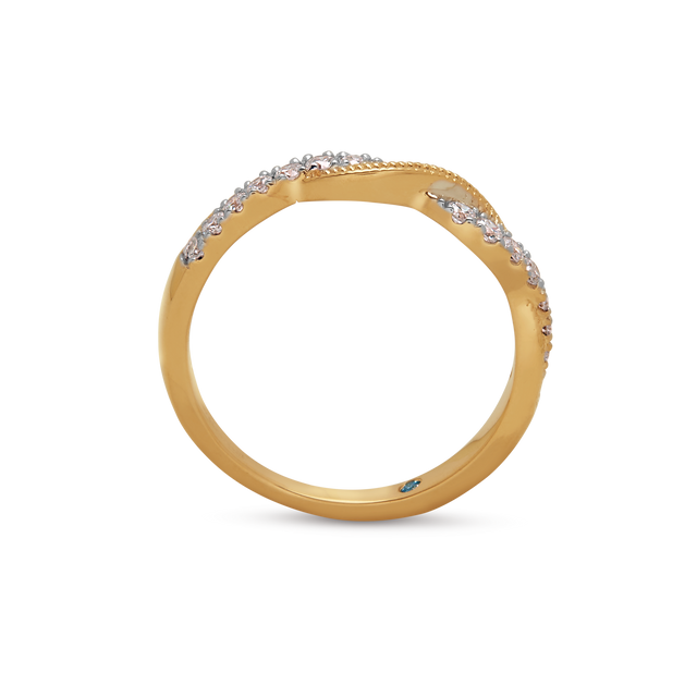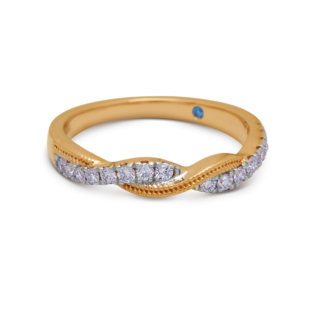 A twisted yellow-gold band threaded with pavé diamonds and milgrain edges—texture and light entwined.