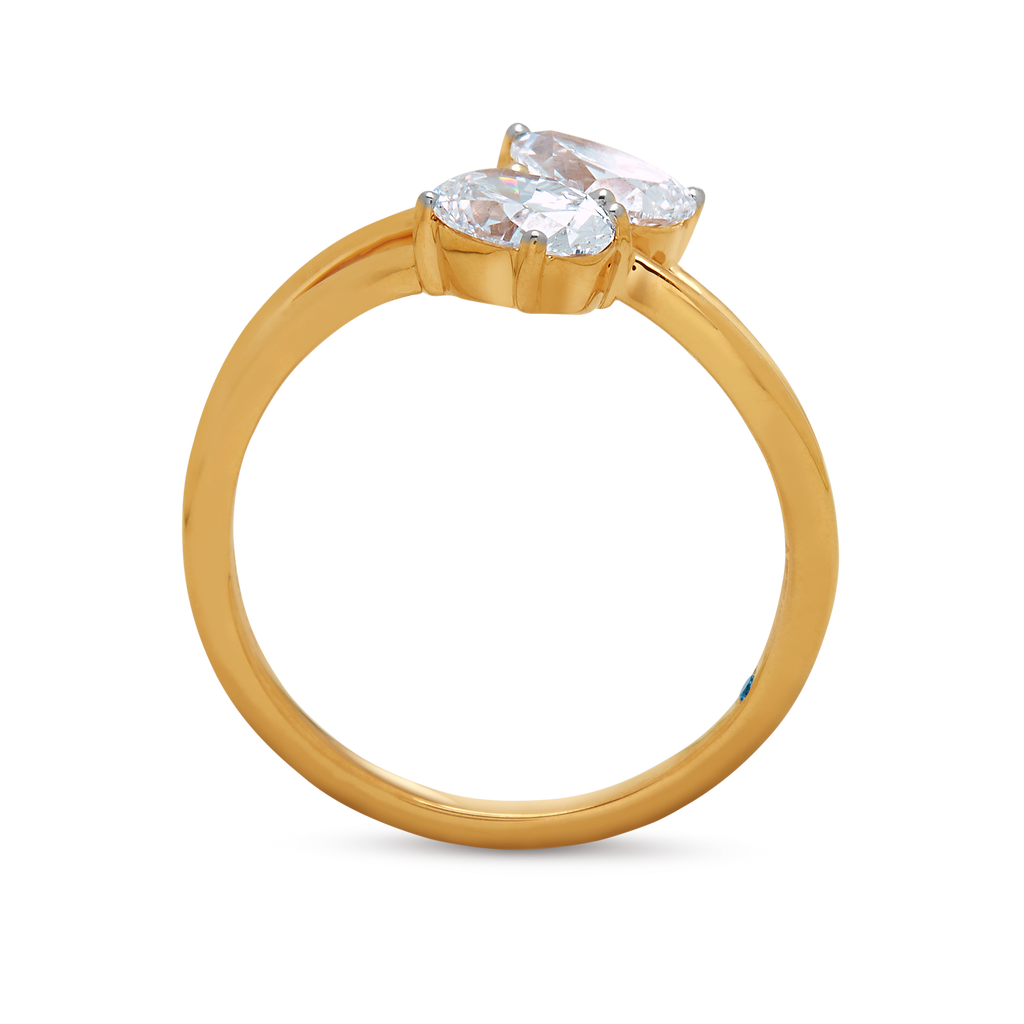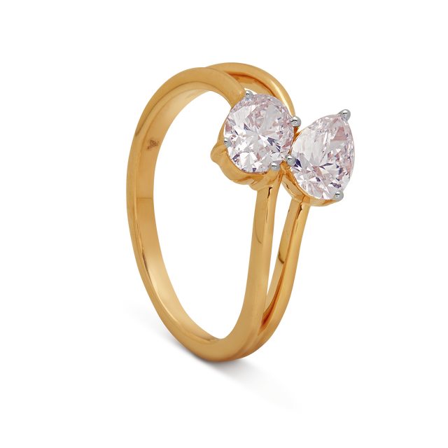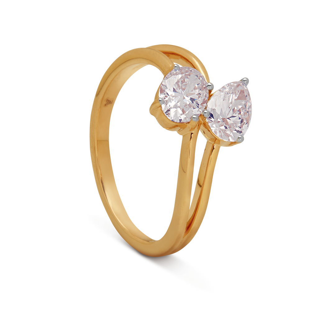 Twin yellow-gold ribbons coil like delicate vines, embracing an oval-cut and a pear-cut diamond—where organic movement meets refined brilliance.