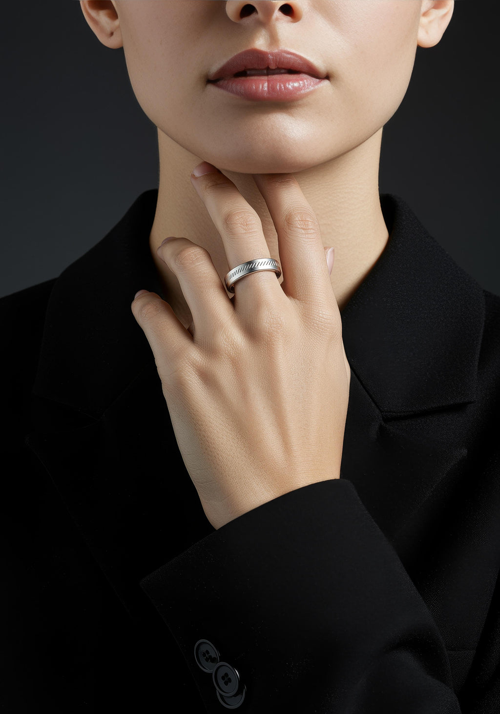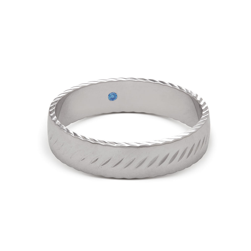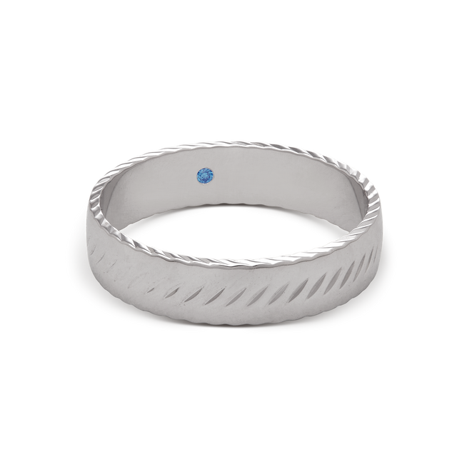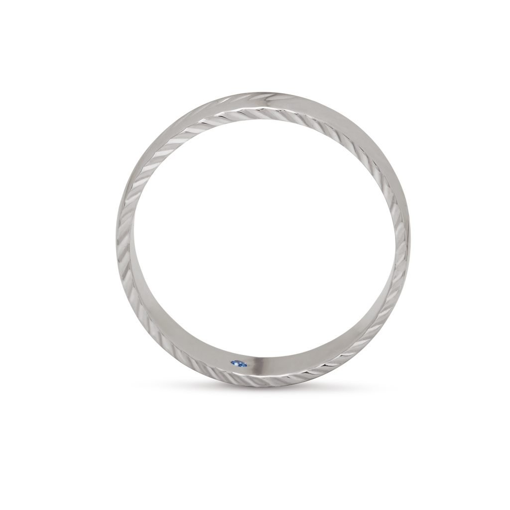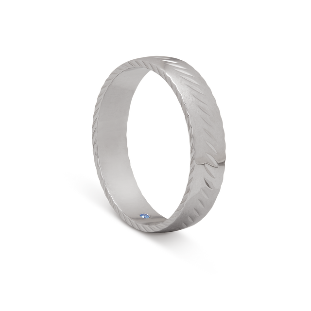 A white-gold band delicately etched carefully—pure, refined simplicity.