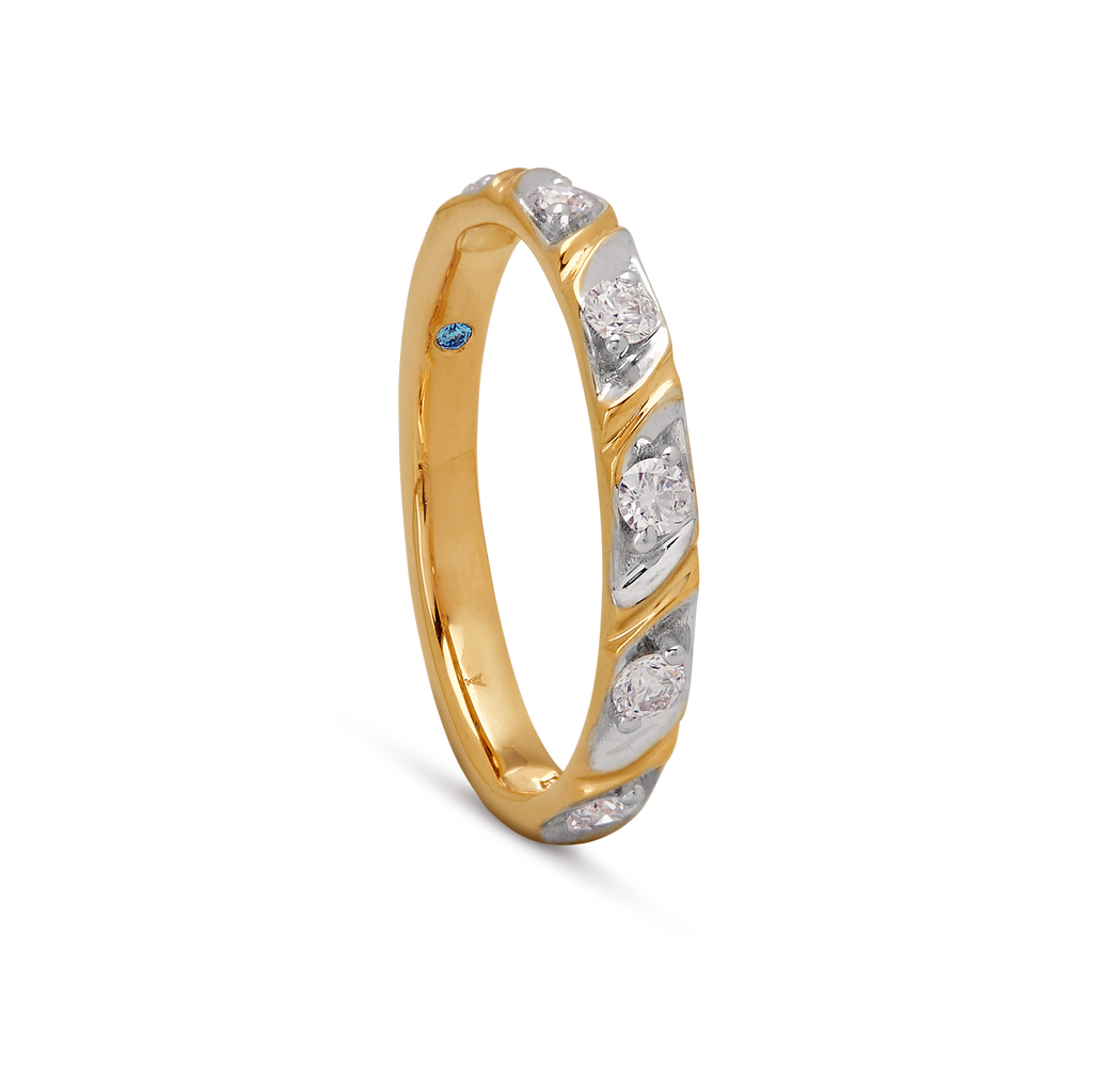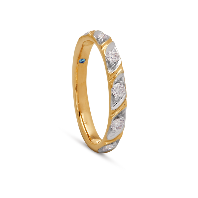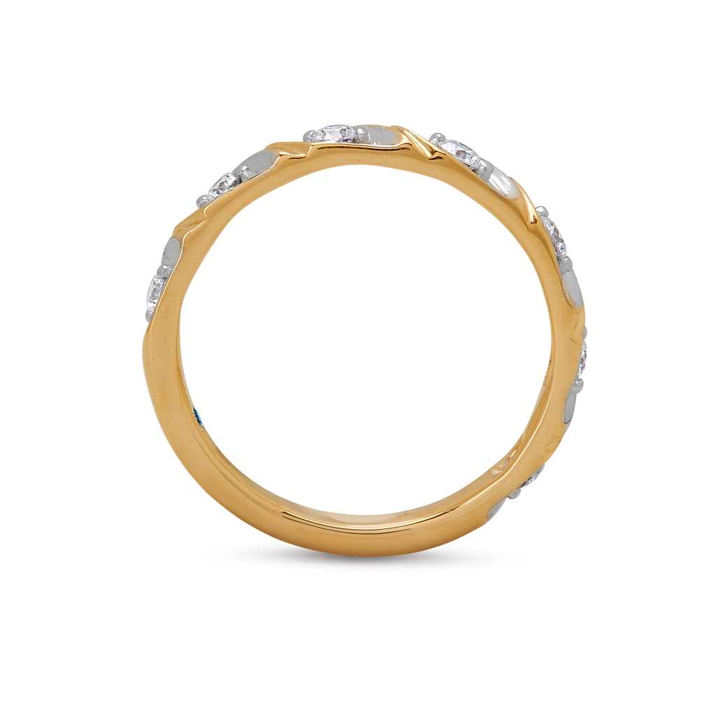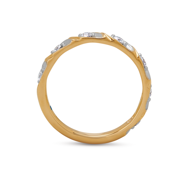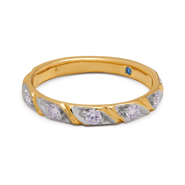 White-gold diamond bezels interlock with yellow-gold bars—an interplay of metal and light in perfect symmetry.
