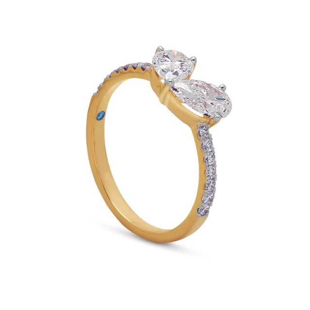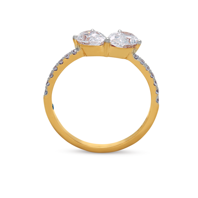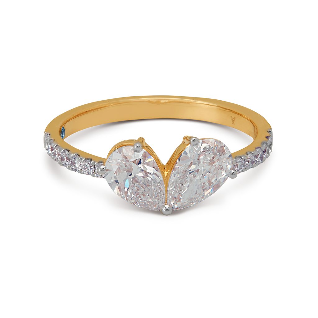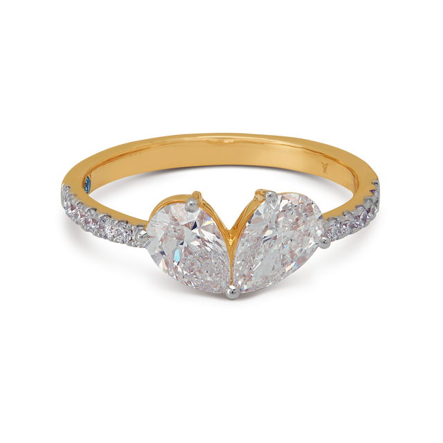 Dual pear-shaped diamonds set on a slender yellow-gold band and framed by pavé-set shoulders—a harmonious duet of form and sparkle.