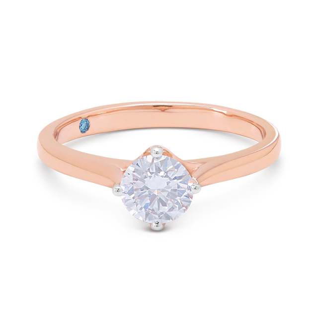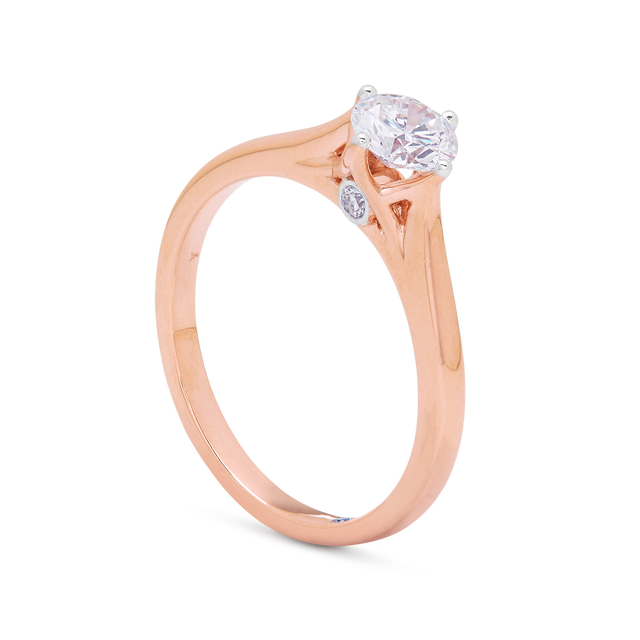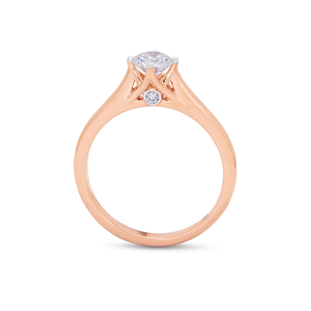 A slender rose-gold band that arches to cradle a brilliant round solitaire in a four-prong embrace—purity and radiance, simplified.