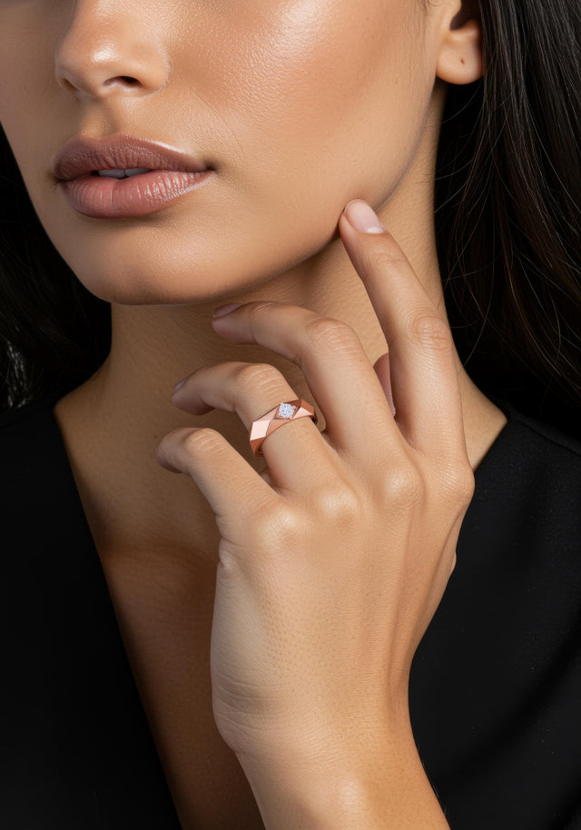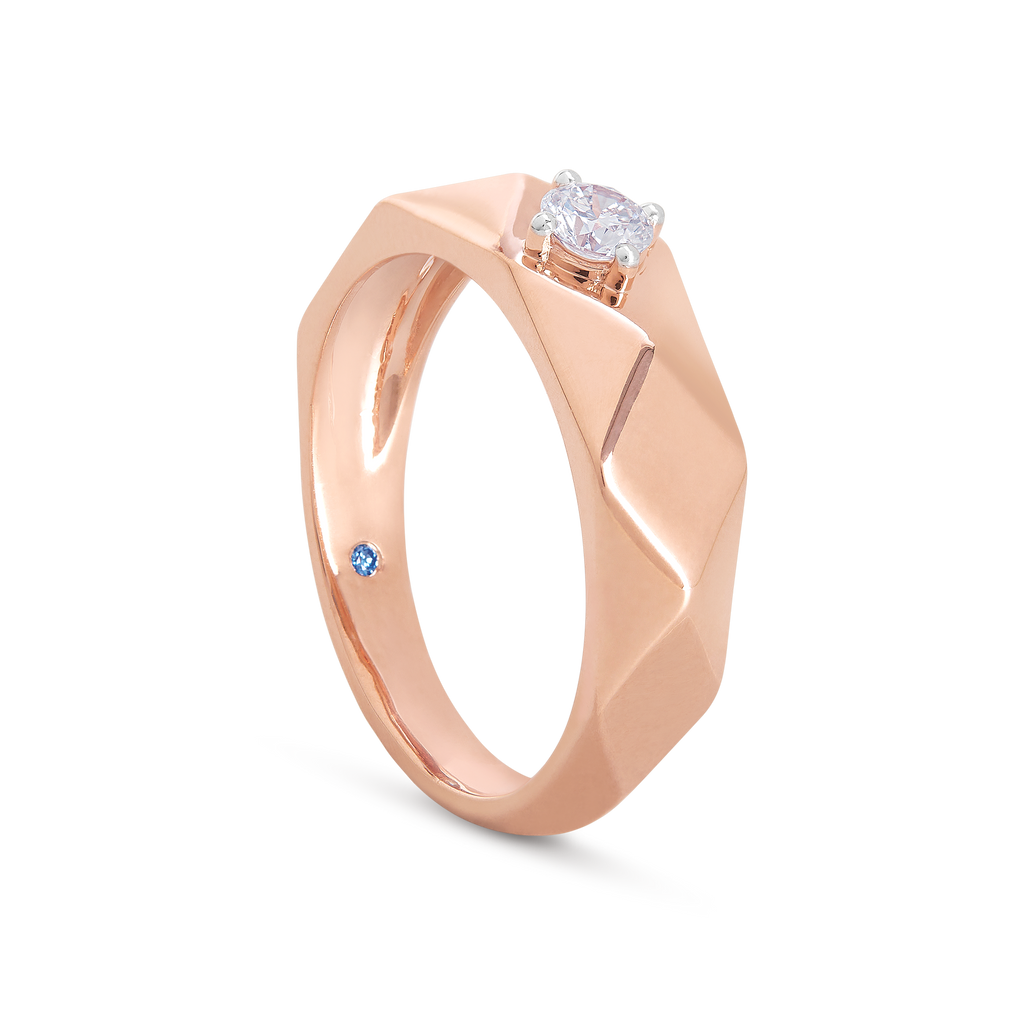 A round brilliant solitaire set in delicate white-gold prongs atop a faceted rose-gold band—where sharp contours meet timeless sparkle.