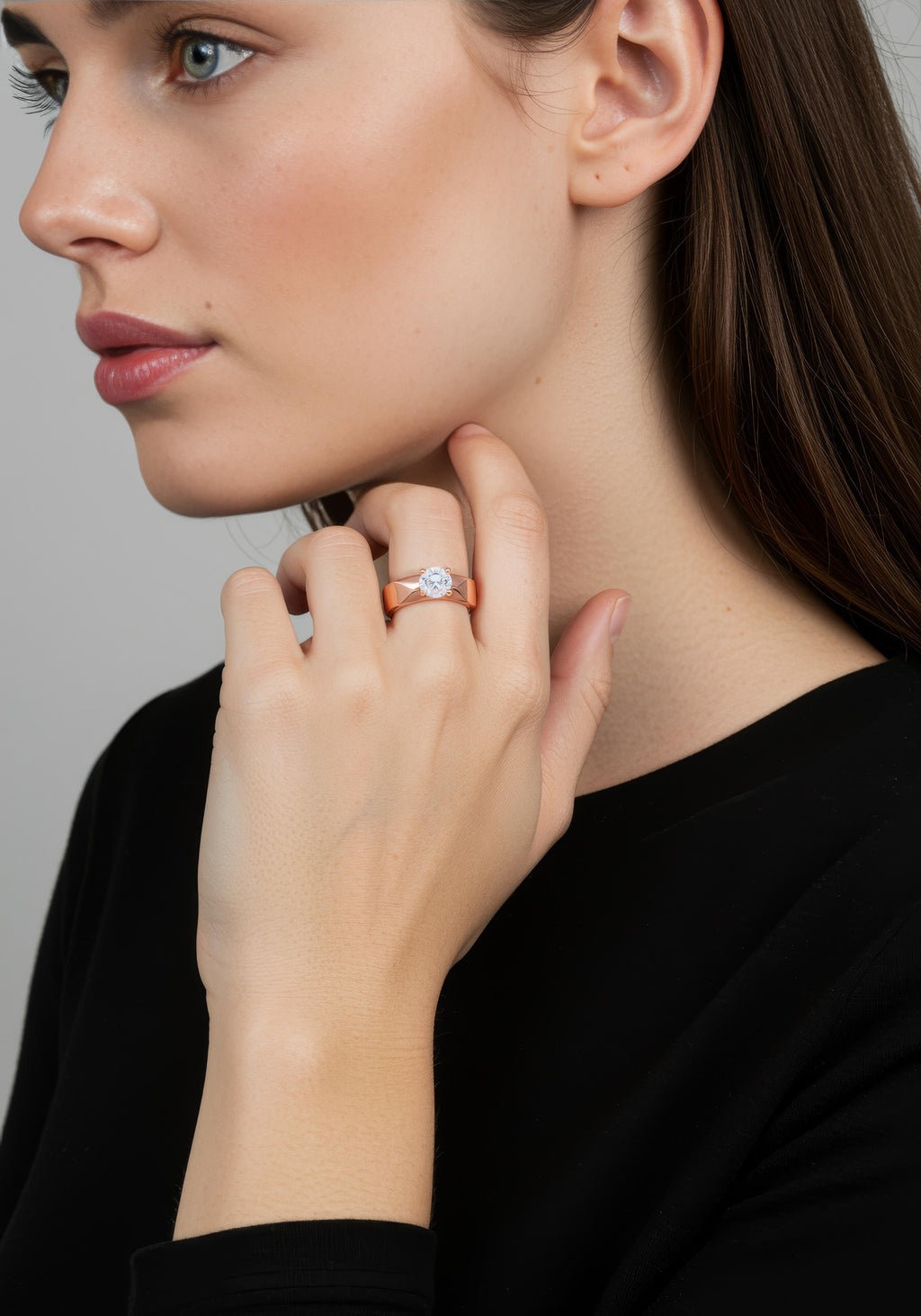 A sculptural rose-gold band faceted with architectural form, crowned with a round brilliant diamond—where geometry meets pure light.